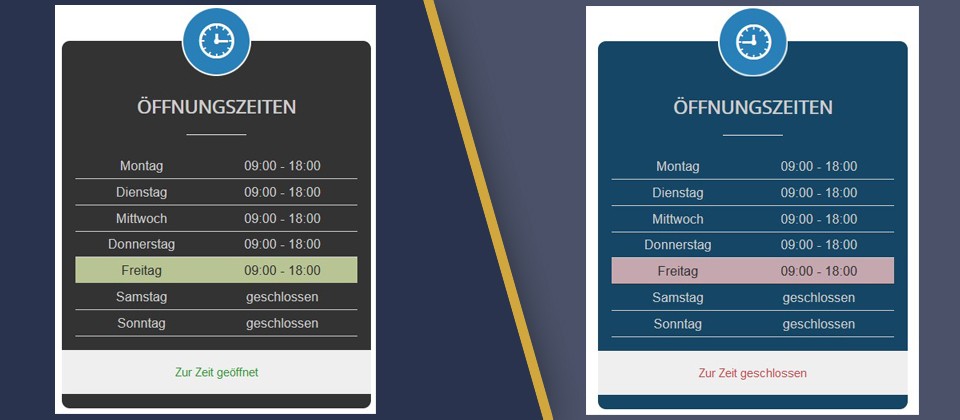 Mit diesem Modul kannst Du auf einfacher Weise die Öffnungszeiten anzeigen lassen. Die Pro Version enthält weitere Funktionen, gegenüber der Free Version. Die Darstellung ob aktuell offen oder geschlossen ist, wird anhand der Systemzeit berechnet. Alle anzuzeigenden Texte und der Wochenstart (Montag oder Sonntag), können individuell eingetragen werden.